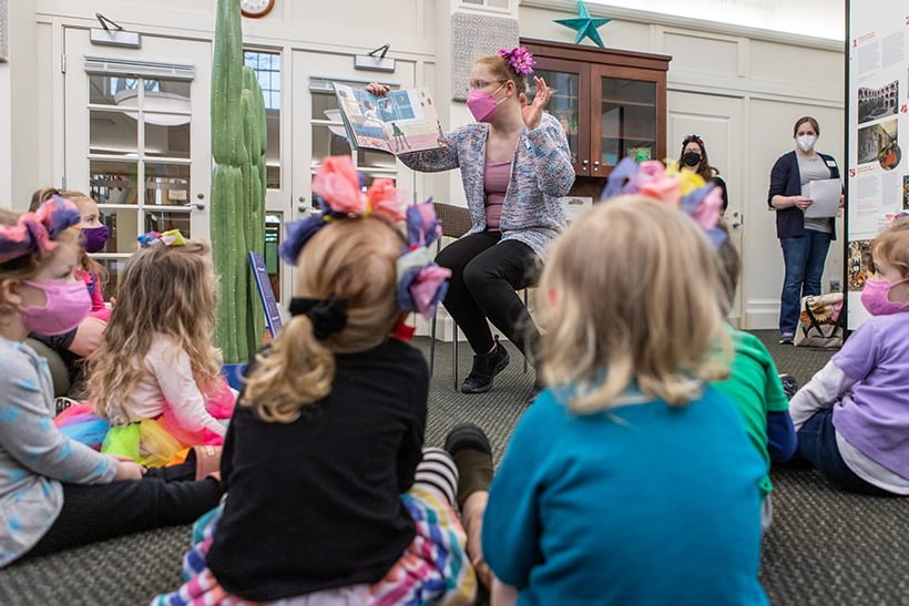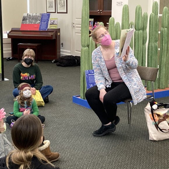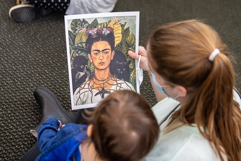 Children and parents from Chelsea Children’s Cooperative Preschool and their teacher, Claire Baushke, visited the library’s exhibition on Feb. 22 and 23. Librarians Miss Edith and Miss Jessica read aloud from the book “Frida Kahlo and Her Animalitos” by Monica Brown. The book features the different animals that Frida Kahlo had in her home and gardens and many that appear in her artwork. They also explored the interactive displays in McKune and learned more about Frida’s self-portrait paintings. (Photos by Burrill Strong.)